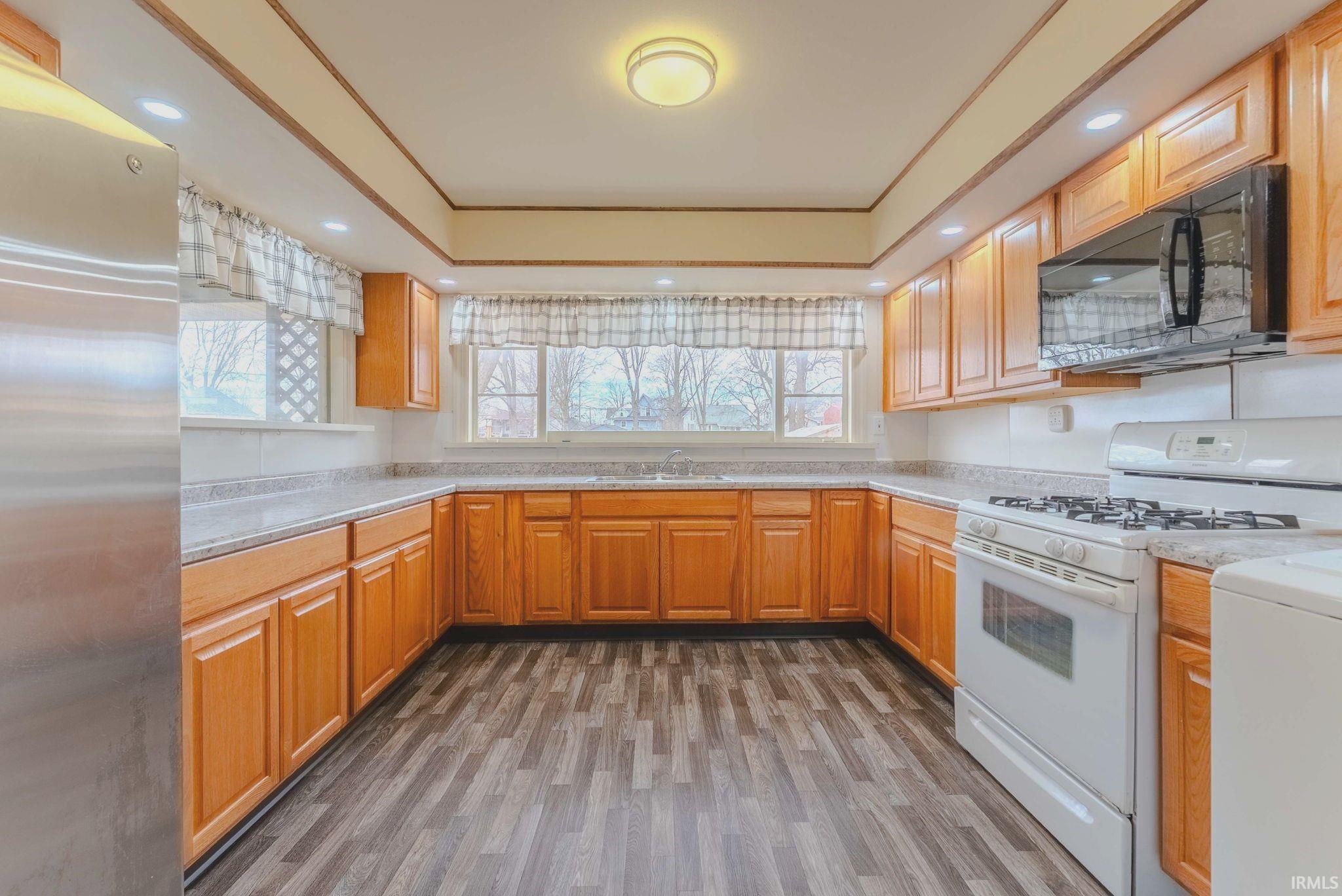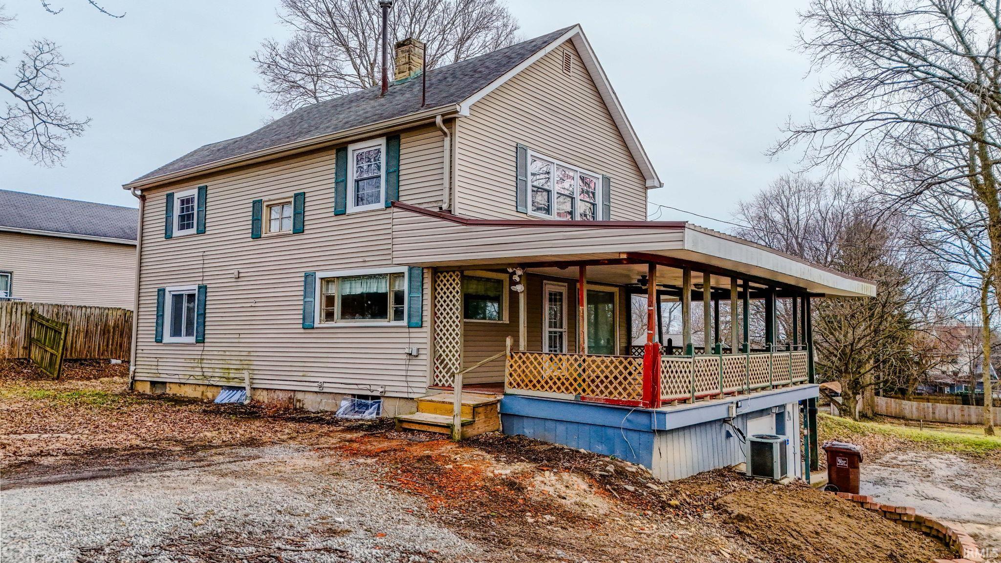 Spacious and recently updated 4-bedroom, 2.5-bath two-story home situated on an impressive .641-acre city lot. This home offers a thoughtfully remodeled interior featuring new kitchen cabinetry and countertops, updated bathrooms, all new flooring, fresh paint, and updated light fixtures throughout. The large kitchen provides abundant cabinet space, an adjoining dining area, and includes all kitchen appliances. A main-level bedroom with private bath adds convenience and flexibility. The living room is generously sized and features a beamed ceiling and bay window. Three additional bedrooms and a second full bath are located on the upper level. The lower level includes a room suitable for a home office with a nonfunctional stone fireplace, a utility room with half bath and a second laundry area, and multiple storage rooms. Most windows are newer vinyl replacements. Outdoor amenities include a large 15’ x 30’ covered deck, an 8’ x 11’ covered side porch, and a 30’ x 21’ pole building partially finished for workshop or recreational use with newer 200-amp electrical service. All located on a rare 98’ x 285’ city lot offering exceptional outdoor space.