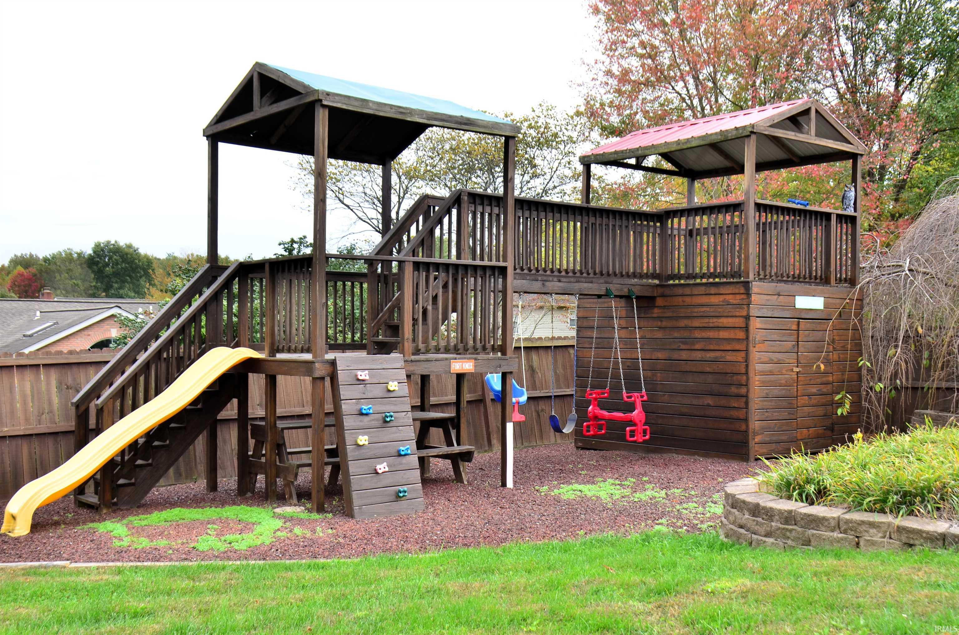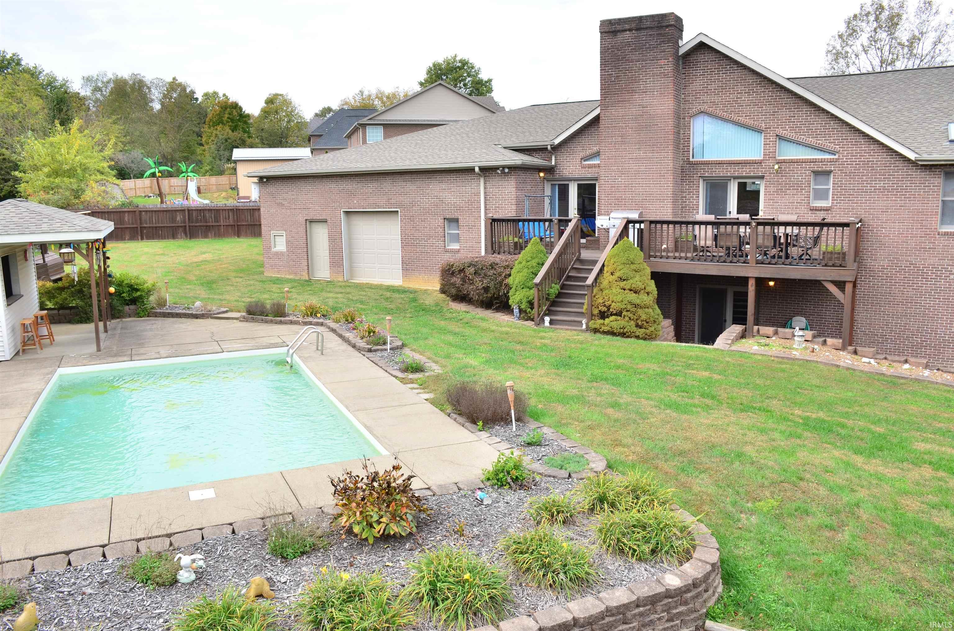 Welcome to this exceptional, custom-built residence situated on a peaceful cul-de-sac on Evansville’s desirable north side. Offering 4 bedrooms, 2.5 baths, and more than 5,000 square feet of thoughtfully designed living space, this home showcases quality craftsmanship and attention to detail throughout. From the moment you enter, the warm wood flooring and inviting entryway set the tone for the comfort and elegance found within.The main level features an open floor plan with cathedral ceilings, a ventless fireplace, and a spacious dining area. The kitchen offers new appliances, a convenient bar-seating area, and an impressive walk-in pantry with exceptional storage. Nearby, the laundry room provides abundant light, nice storage , and a convenient built-in ironing board. The main-level owner’s suite includes its own fireplace and a recently updated ensuite bath with a soaking tub, walk-in tiled shower, and a third fireplace for a resort-style retreat. A second bedroom and full hall bath complete the main floor. The lower level is designed for entertaining, featuring a large family/rec room, stunning bar area, and two additional spacious bedrooms. The half bath on this level also functions as a tornado/safe room with a steel door for peace of mind. The pool, pool house, play area, deck and HUGE Garage with the through and through doors, round out the Greatness of the backyard and is attractive for those who desire storage and room for several vehicles. This home offers space, function, style, and comfort — all in a desirable and private north side location.
