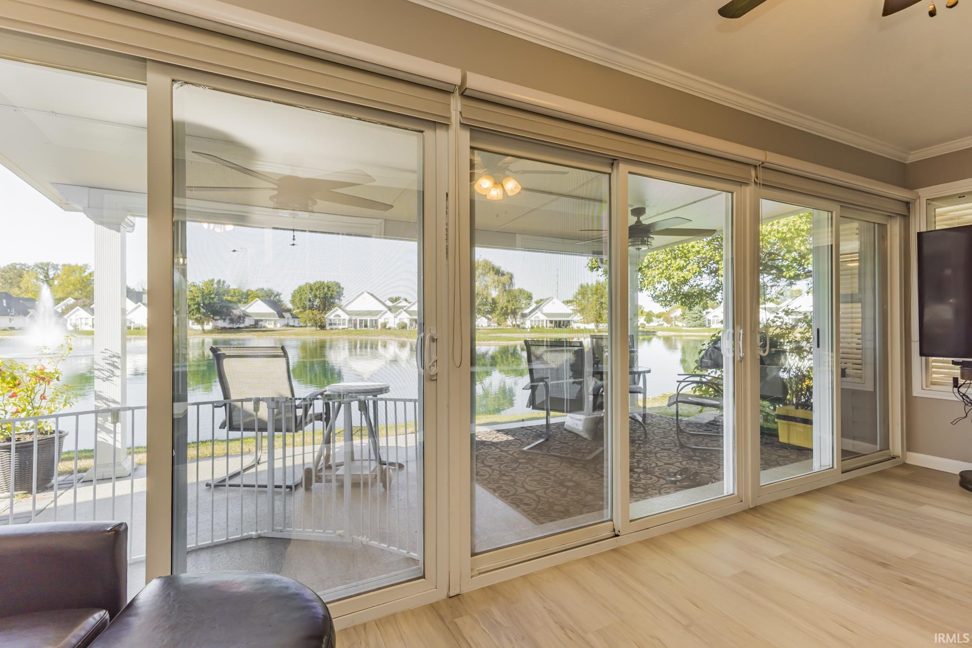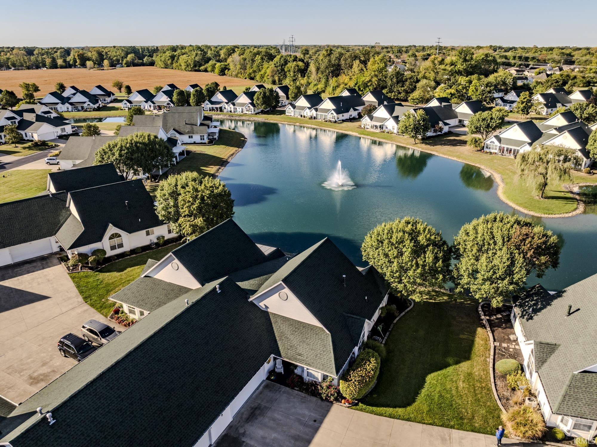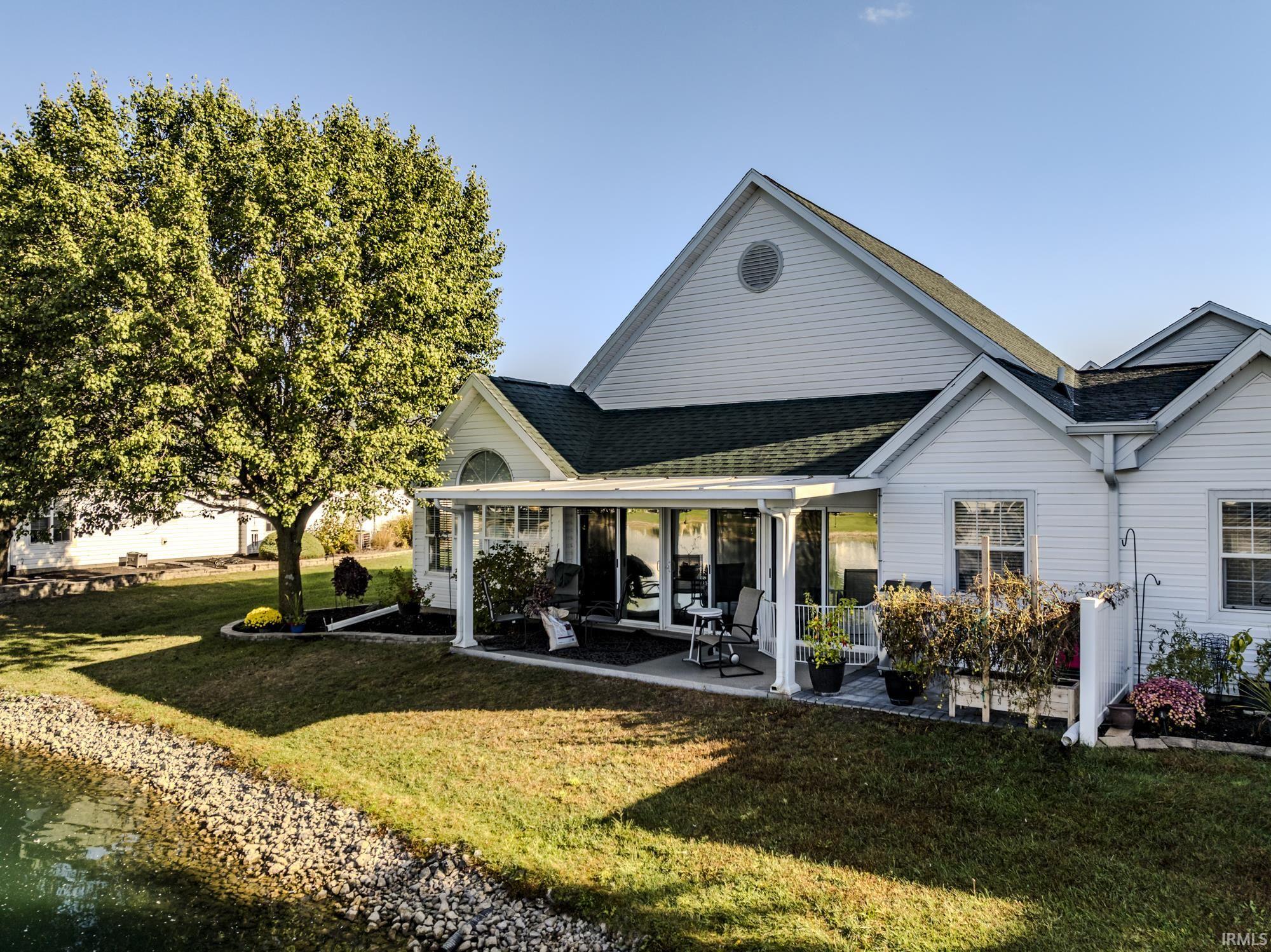 Willow Lake Condo on the Pond – Spacious 2-bedroom, 2-bath condo offering great room, formal dining, den, eat-in kitchen, and a heated/cooled sunroom with peaceful pond views. Outdoor living area features an extended paver patio, & LJ Stone permanent awning. Recent Updates: 2024: new roof, gas water heater, dishwasher, kitchen sink & faucet, fireplace blower, extended rear patio, 2023: new LVP flooring throughout, painted kitchen cabinets & replaced lighting, painted interior including ceilings, new disposal, 2022: epoxy-coated garage floor & back patio, new landscaping border, 2021: water softener, toilets, patio ceiling fans, permanent awning, 2020: new central A/C (10-year compressor warranty). Residents enjoy access to the pool, pond, clubhouse, library, and exercise room. HOA dues are $275/month. One pet less than 40 pounds is welcome. Quick possession.